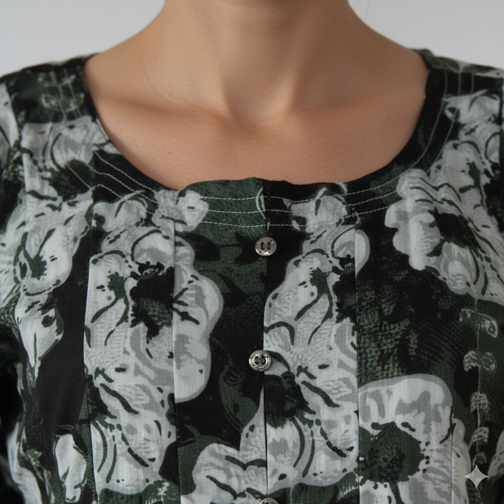Midnight Bloom is a dark floral printed kurti designed for effortless everyday elegance. Crafted in soft, breathable fabric, this long kurti offers comfort with a graceful silhouette. Perfect for office wear, casual outings, and small gatherings. Pair it with black, white, or neutral bottoms for a timeless ethnic look.