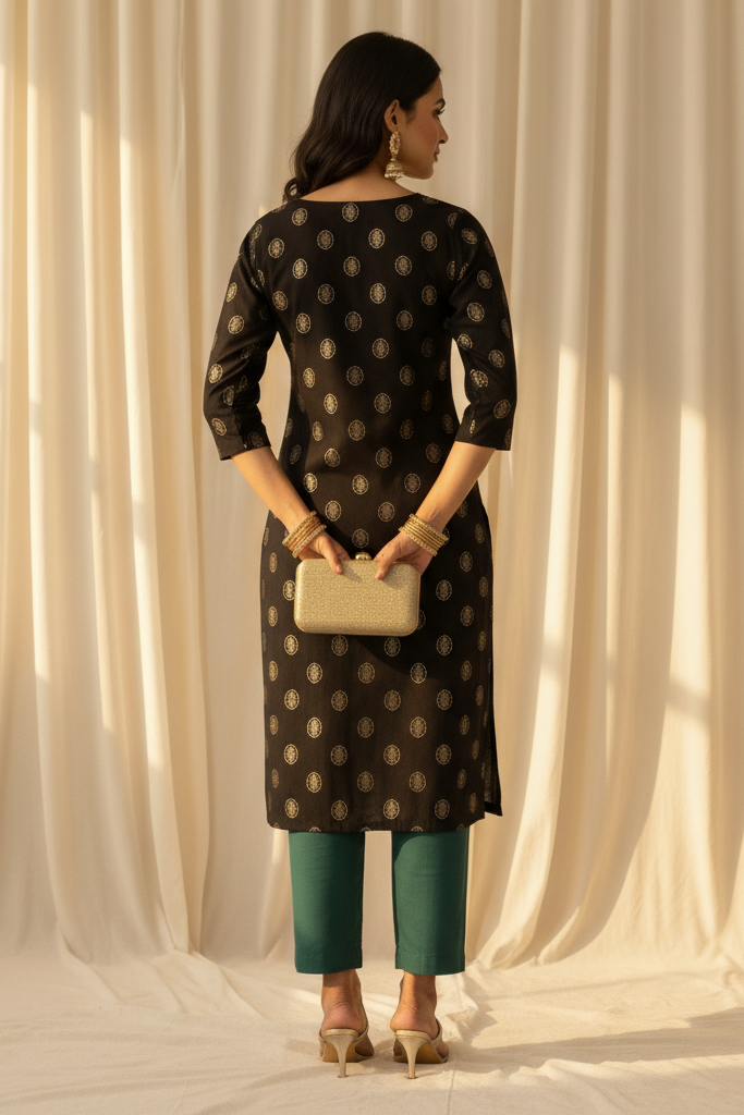 Elevate your ethnic wardrobe with this elegant black and gold Anarkali kurti for women. Designed with a graceful flare and subtle golden motifs, this festive kurti offers a perfect blend of tradition and modern style. The flattering Anarkali silhouette enhances movement, making it ideal for festive occasions, family gatherings, and special events.
