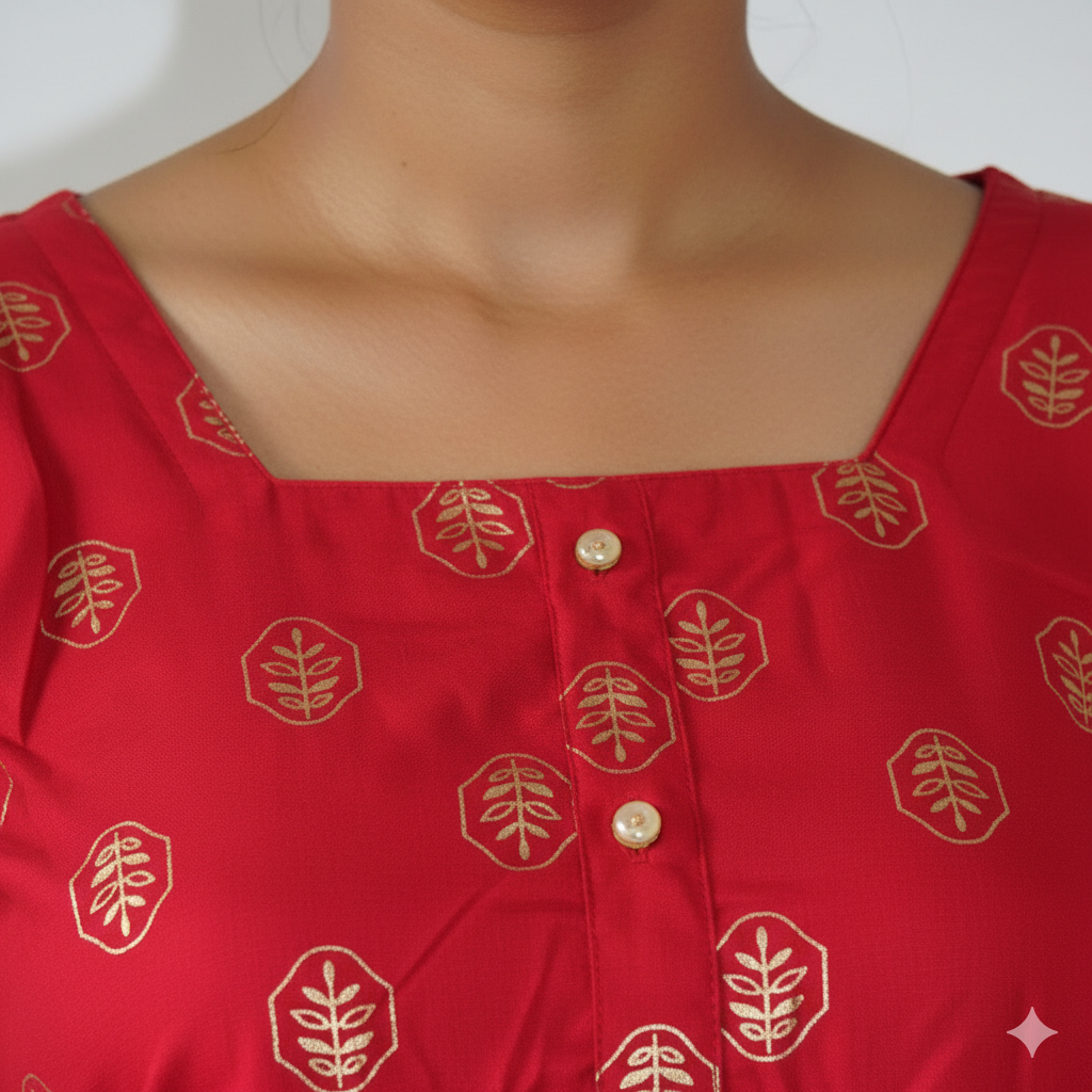 Scarlet Glow is a bold red kurti highlighted with gold motifs, perfect for festive and special occasions. This elegant straight-cut long kurti offers a flattering fit and comfortable fabric for all-day wear. Pair it with cream, gold, or matching red bottoms for a stunning traditional look.